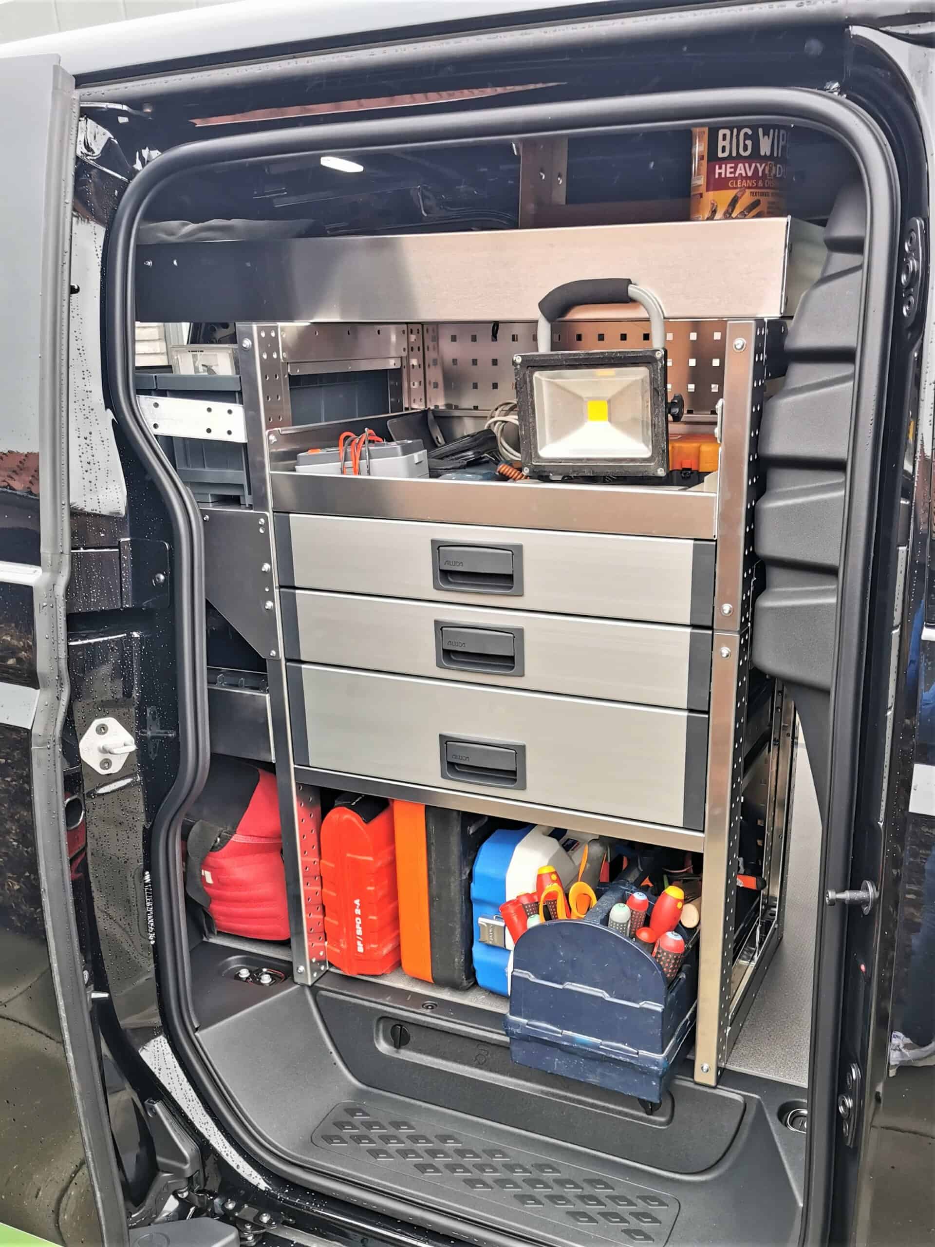 Det nyeste køretøj i Vandt & Vandt-familien er som sagt blevet indrettet med reoler, ophæng og skuffer til diverse værktøj, kabelruller og øvrigt grej, som skal bruges, når elektrikeren skal holdes i stødet.