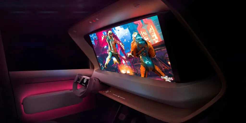 I konceptbilen er der naturligvis skruet op for ambitionerne. For eksempel forestiller Volkswagen sig, at musik, film og spil fra mobiltelefonen kan vises på en integreret projektionsskærm. Den kan trækkes ud af instrumentbrættet, når det kræves. Yderligere enheder kan tilsluttes individuelt og forsynes med strøm fra en 230 volt / 16 ampere forbindelse i kabinen.
